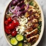A white oval bowl holds a colorful layered dish. The base layer is light beige quinoa mixed with green leafy bits, filling most of the bowl. On top, grilled chicken breast slices with a golden brown, slightly charred surface are arranged diagonally in the center right. To the left, thinly sliced purple-red onions sit next to small crumbled white feta cheese scattered over the onions and quinoa. Juicy, vibrant red cherry tomatoes are grouped at the bottom left. Near the bottom right, fresh cucumber slices show a shiny green skin with a hint of yellow oil on top. Dark purple Kalamata olives are placed above the cucumber, completing the mix of textures and colors. The whole bowl is set on a white marbled surface. photo taken with an iphone --ar 4:5 --v 7