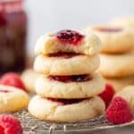 Keywords: raspberry thumbprint cookies, cheesecake cookies, 5 ingredient cookies, easy cookie recipe, raspberry jam cookies