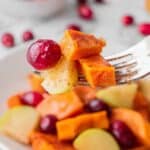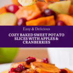 Keywords: baked sweet potatoes, sweet potato slices, baked apples, cranberries, fall side dish, vegetarian, maple syrup, roasted vegetables
