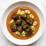 The dish shows a white shallow bowl filled with a rich, brown sauce as the base layer, smooth and glossy in texture. On top, there are several chunks of dark brown braised meat, tender and coated with the sauce, scattered evenly in the middle. Small pieces of light beige gnocchi or dough-like shapes are nestled within the sauce around the meat. Bright green chopped herbs are sprinkled over the top, adding a fresh color contrast. The whole arrangement sits on a white marbled surface. photo taken with an iphone --ar 4:5 --v 7