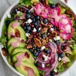 - Add Toppings: Top the greens evenly with candied pistachios, thinly sliced red onion, watermelon radish slices, sliced avocado, blueberries, pomegranate arils, and crumbled feta cheese. Distribute all ingredients evenly for balanced flavor and presentation.