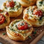 Caprese Pesto Puff Pastry Bites are a delightful blend of flaky puff pastry, fresh basil pesto, juicy cherry tomatoes, and creamy mozzarella. These bite-sized appetizers bring all the vibrant flavors of a classic Caprese salad into a fun, easy-to-make treat perfect for any gathering or snack time.