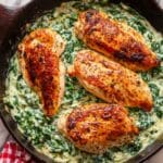 This Cheesy Spinach Stuffed Chicken Breasts recipe features tender boneless chicken breasts stuffed with a creamy mixture of cream cheese, mozzarella, parmesan, garlic, and fresh spinach. The chicken is seared to develop a golden crust and then baked to juicy perfection, making for a flavorful and satisfying entree that’s perfect for a quick weeknight dinner.
