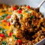 This classic Ground Beef and Rice Casserole is a hearty, all-in-one skillet meal perfect for weeknights. Featuring browned ground beef, flavorful spices, vegetables, and jasmine rice simmered in chicken broth, it combines protein, veggies, and rice in one pan for minimal cleanup and maximal flavor. Finished with fresh spinach, melted Mexican cheese, and a splash of lime juice, it’s a family-friendly dish with mild, kid-approved flavors that’s both budget-friendly and nutritious.