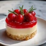 A small round dessert with three distinct layers sits on a white plate placed on a white marbled surface. The bottom layer is a crumbly light golden-brown crust, slightly uneven and textured. Above that is a thick, smooth pale yellow layer that looks creamy and firm. The top layer is a shiny, bright red jelly with whole, glossy strawberries embedded in it and fresh green rosemary sprigs scattered on top. The dessert is lit naturally, highlighting the glossiness of the strawberries and jelly. photo taken with an iphone --ar 4:5 --v 7