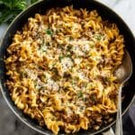 A black skillet filled with curly, light golden pasta layered with ground cooked meat mixed evenly throughout. On top, there is a sprinkling of grated cheese and small green herb pieces scattered for color contrast. A silver spoon rests on the right side inside the skillet. The skillet is placed on a white marbled surface with a few green leaves in the background. Photo taken with an iphone --ar 4:5 --v 7