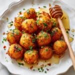 These Crispy Goat Cheese Poppers with Honey are delightful bite-sized appetizers featuring soft goat cheese balls coated in a crunchy panko crust, fried to golden perfection, then drizzled with sweet honey and garnished with fresh chives. Perfect for entertaining or a sophisticated snack.