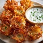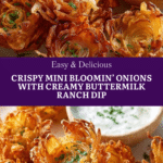 Crispy Mini Bloomin’ Onions with Creamy Buttermilk Ranch Dip offer a delightful, bite-sized version of the classic bloomin’ onion, perfect for sharing as an appetizer or party snack. These sweet onions are carefully cut into flower shapes, soaked in buttermilk, coated in seasoned flour and breadcrumbs, then deep-fried until golden and crispy. Paired with a rich, tangy buttermilk ranch dip, they provide a satisfying crunch and bold flavor that will keep guests coming back for more.