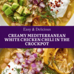 Keywords: white chicken chili, Mediterranean chili, slow cooker chili, crockpot chicken chili, white bean chili, healthy chili recipe, creamy chicken chili