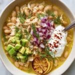 White chicken chili is a comforting twist on traditional chili con carne, featuring tender chicken and creamy white beans. This recipe adds a Mediterranean flair with fresh lemon, dill, and tangy feta for a unique and flavorful meal perfect for any day of the week.