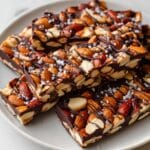 These homemade Dark Chocolate and Sea Salt Nut Bars are delightfully crunchy with the perfect balance of salty and sweet. Made with a blend of roasted nuts bound by brown rice syrup, then baked and coated with melted dark chocolate and a sprinkle of flaky sea salt, these bars are a delicious, wholesome snack reminiscent of popular store-bought nut bars but with fewer ingredients and no preservatives. Perfect for anyone craving a satisfying and nutritious treat.