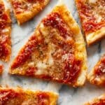 The image shows several slices of pizza with a golden brown crust, topped with melted cheese that has a slightly browned, bubbly texture. There are visible layers of red tomato sauce under the cheese, creating a rich contrast. The crust edges are thin and crispy with a light golden color. The slices are arranged close together on a white marbled surface, showing some areas where the cheese has caramelized and sprinkled with a dusting of grated cheese or seasoning. photo taken with an iphone --ar 4:5 --v 7