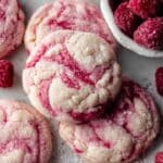 Delight in these soft and scrumptious Raspberry Cookies made with gluten-free flour and bursting with fresh and syrupy raspberry flavors. These cookies boast a lovely marbled pink appearance, achieved with fresh raspberries and homemade raspberry syrup, offering a perfect balance of tartness and sweetness. The dough is carefully frozen before baking to ensure the cookies hold their shape without spreading, resulting in large, tender cookies with a delicate crumb.