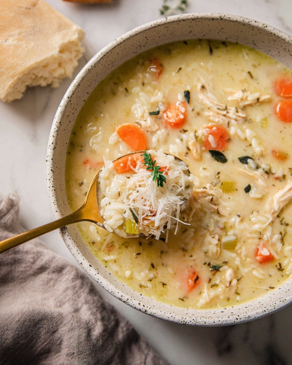 A creamy chicken and rice soup served in a white speckled bowl. The soup shows a thick light yellow broth with visible chunks of orange carrots, white rice, and shredded chicken scattered throughout. There are small green herb leaves sprinkled on top and a light dusting of grated cheese covering part of the soup. A gold spoon scoops up a portion revealing more rice, carrots, and chicken pieces with a small green sprig on top. In the background on a white marbled surface, there is a piece of light-colored bread and a folded gray cloth near the bowl. photo taken with an iphone --ar 4:5 --v 7