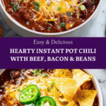 Hearty and cozy Instant Pot Chili packed with crispy bacon, ground beef, beans, and warm smoky spices. This flavorful chili tastes like it’s been slow-simmered for hours but cooks in just 30 minutes using an Instant Pot.