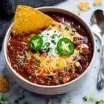 Hearty and cozy Instant Pot Chili packed with crispy bacon, ground beef, beans, and warm smoky spices. This flavorful chili tastes like it’s been slow-simmered for hours but cooks in just 30 minutes using an Instant Pot.