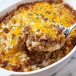 - Assemble Casserole: Transfer the cheesy beef mixture into the prepared baking dish. Evenly sprinkle the remaining 1/2 cup shredded cheddar cheese on top.