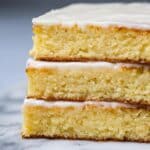 The image shows three thick slices of yellow cake with a rough, crumbly texture, stacked closely side by side on a white marbled surface. Each slice has one layer topped with a smooth, white icing giving a glossy finish. The cake layers appear moist and dense, with the icing evenly spread across the top of each slice. The background is blurred, keeping the focus on the neat rows of cake pieces. Photo taken with an iphone --ar 4:5 --v 7
