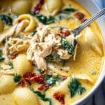 Marry Me Chicken Soup is a creamy, comforting dish packed with tender rotisserie chicken, sun-dried tomatoes, fresh basil, and a blend of cheeses. This flavorful soup is finished with tender pasta and spinach, making it a complete and satisfying meal perfect for cozy nights.