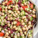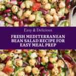A vibrant and nutritious Mediterranean Bean Salad featuring a medley of beans, fresh vegetables, herbs, and a zesty lemon-garlic dressing. This no-cook, easy-to-make dish is perfect as a light meal or a wholesome side, bursting with Mediterranean flavors and a touch of Parmesan cheese.