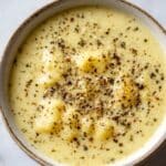 A close-up view of a white bowl filled with creamy, pale yellow soup that has a smooth, thick texture with soft chunks throughout. The soup is topped with a sprinkle of coarse black pepper scattered unevenly across its surface. The bowl sits on a white marbled textured surface, which enhances the light color of the soup and the contrast of the pepper. The bowl’s rim is slightly rustic with a thin, darker edge. photo taken with an iphone --ar 4:5 --v 7