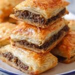 A stack of square-shaped pastries with a golden brown, crispy, and flaky top layer showing many thin, delicate layers. The middle layer is filled with dark brown minced meat, tightly packed and slightly crumbly in texture, sandwiched between the flaky top and bottom pastry layers. The bottom pastry is equally golden and flaky, creating a strong base. The pastries are piled on a white plate with a blue rim, placed on a white marbled surface. photo taken with an iphone --ar 4:5 --v 7