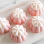 The image shows five small, round pink desserts arranged on a white plate with a soft texture and a slightly translucent look. Each dessert has a white, creamy swirl on top that forms a flower-like shape with soft, smooth petals. The pink base has a fluted pattern on the sides, giving it a gentle ridged texture, and the white creamy top contrasts with the pink base, adding a delicate look. The plate rests on a surface with a white marbled texture. photo taken with an iphone --ar 4:5 --v 7