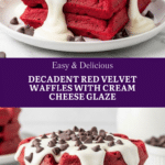 Keywords: red velvet waffles, cream cheese glaze, breakfast waffles, brunch recipe, easy waffle recipe, red velvet recipe