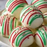 - Add Festive Candy Drizzles and Finish: Melt the red and green candy melts separately until smooth. Drizzle thin lines of candy melts over the white chocolate-coated truffles using a fork or squeeze bottle, alternating colors for a festive look. Let the drizzles set at room temperature for 15 minutes until hard. Store finished truffles in an airtight container in the refrigerator for up to 2 weeks.