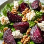 Keywords: roasted beet salad, arugula salad, feta cheese, walnuts, balsamic dressing, healthy salad, Mediterranean salad, vegetarian salad