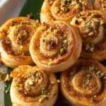 These Savory Ricotta and Pumpkin Pinwheels are a delightful holiday appetizer featuring a creamy mixture of ricotta and pumpkin spiced with garlic, onion powder, and fresh sage, all wrapped in flaky puff pastry. Topped with Parmesan and pistachios, then brushed with a sweet maple-butter glaze, these elegant pinwheels offer a perfect balance of savory and sweet flavors, ideal for festive gatherings.