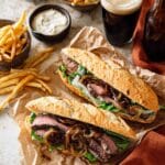 Steak Sandwich with garlic aioli is a deliciously gourmet sandwich featuring tender skirt steak, caramelized onions, and melted provolone cheese. Topped with a creamy homemade garlic aioli, it’s an indulgent meal perfect for dinner or a hearty lunch.