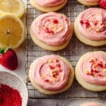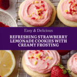 Keywords: Strawberry lemonade cookies, lemon sugar cookies, strawberry buttercream, lemon zest cookies, freeze-dried strawberry frosting, spring cookies, summery cookies, soft lemon cookies