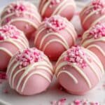 - Drizzle and Decorate: Drizzle the white candy over the pink-coated truffles in a decorative pattern, then sprinkle the top with crumbled shortcake pieces for texture and appearance.