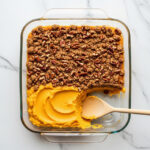A glass baking dish filled with a two-layer dessert on a white marbled texture. The bottom layer is smooth, bright orange with a soft, mashed texture, appearing thick and creamy. The top layer is a crumbly brown topping with chunks of pecans scattered evenly, giving a crunchy look. One corner of the dish is partially scooped out with a light wooden spoon resting inside, showing the contrast between the smooth orange base and the coarse pecan topping. photo taken with an iphone --ar 4:5 --v 7
