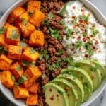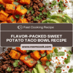 Juicy, spice-kissed ground beef, roasted smoky sweet potatoes, and all your favorite taco toppings come together in this vibrant, build-your-own Sweet Potato Taco Bowl. It’s hearty, healthy-ish, and hits that “comfort food with a twist” sweet spot. Perfect for meal-prepping or feeding a crowd, this bowl is endlessly customizable and bursting with flavor and nutrients.