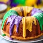 - Decorate: Drizzle the glaze over the cooled cake. While still wet, sprinkle alternating sections with purple, green, and gold colored sugar to mimic traditional Mardi Gras colors.