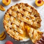 Keywords: Peach pie, summer dessert, fruit pie, homemade pie, flaky crust, sweet peaches